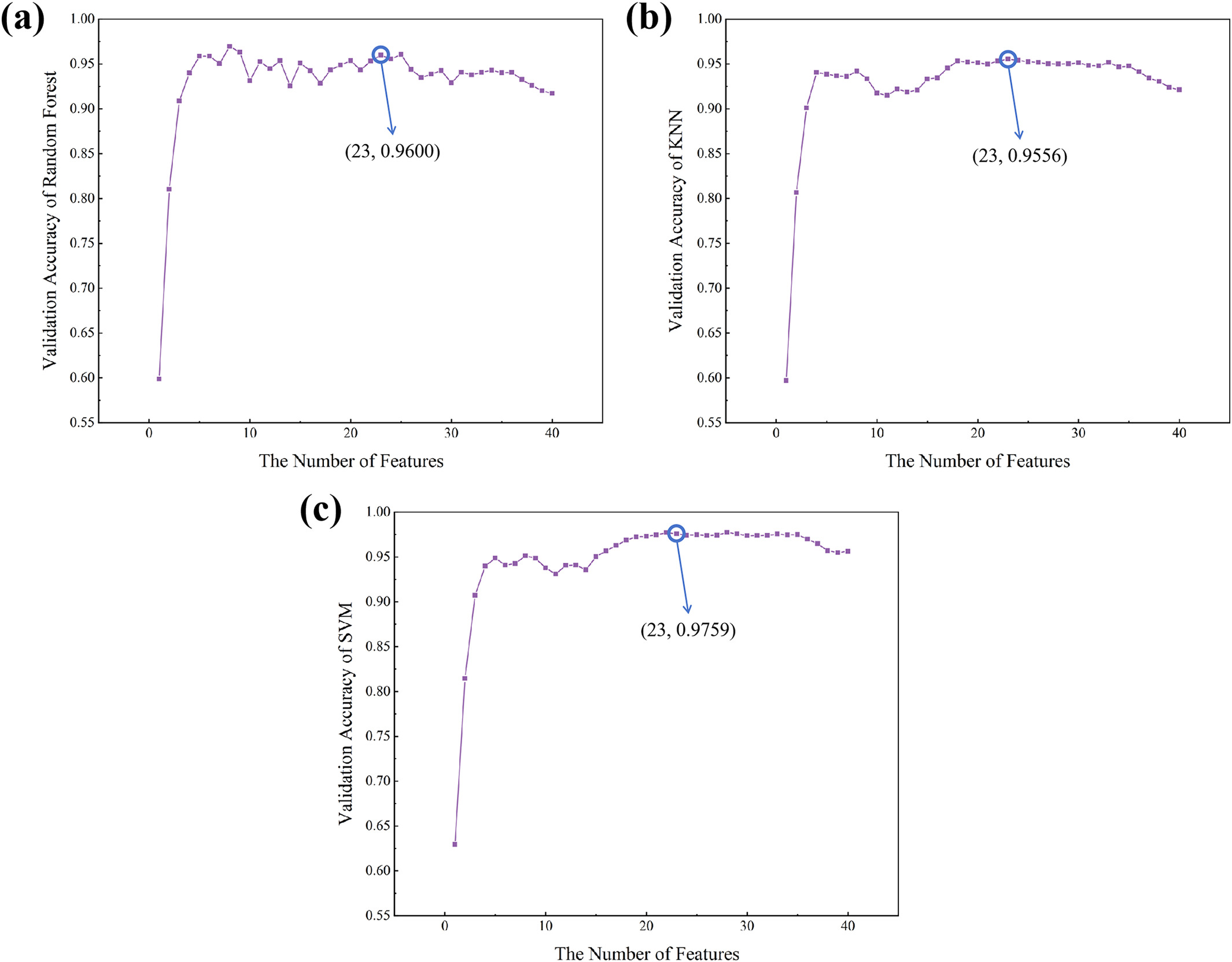 特征维度递增模型的验证准确率趋势:(a) 随机森林;(b) KNN;(c) SVM