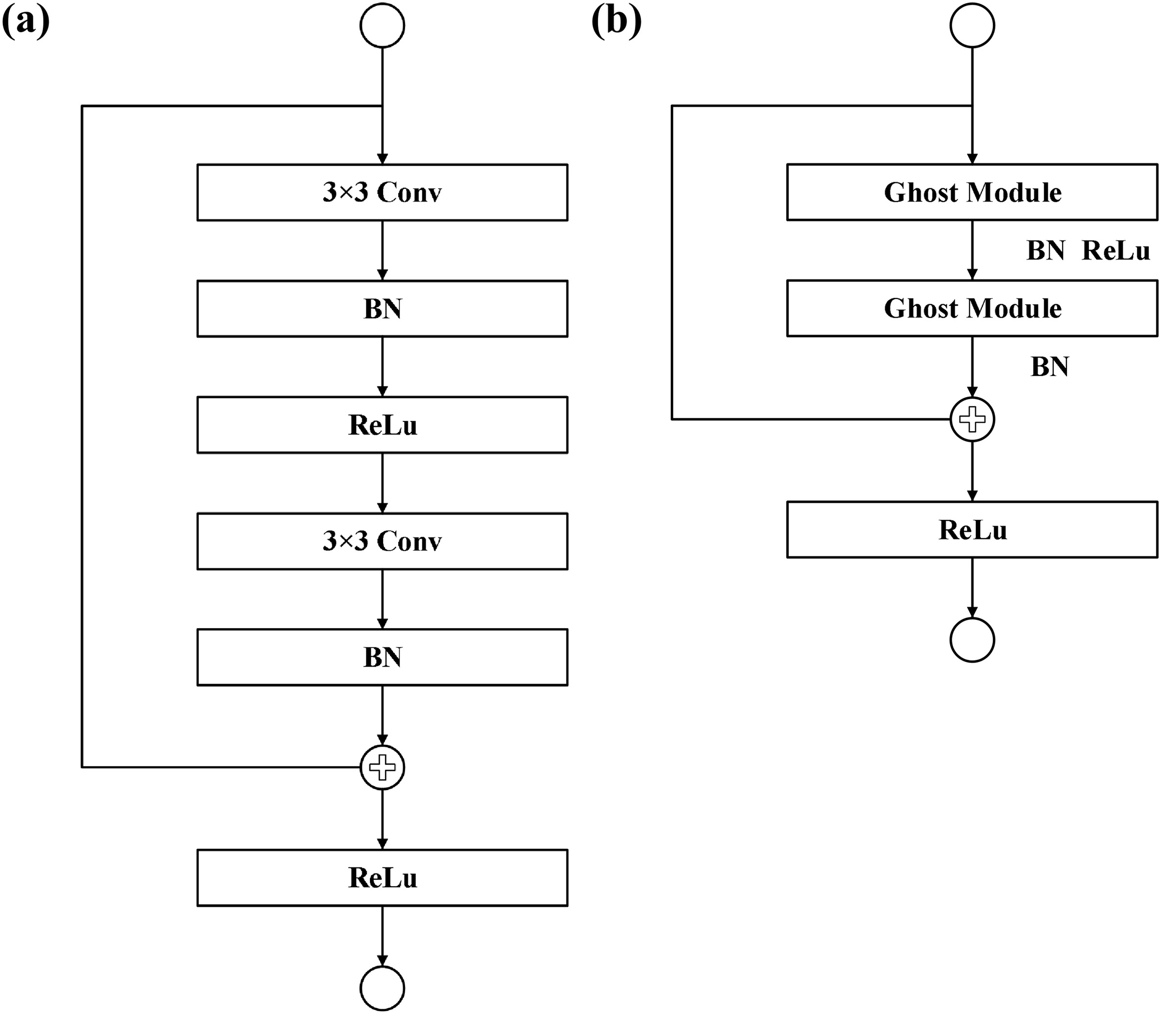 网络中的模块结构:(a)Basic Block;(b)Ghost Bottleneck