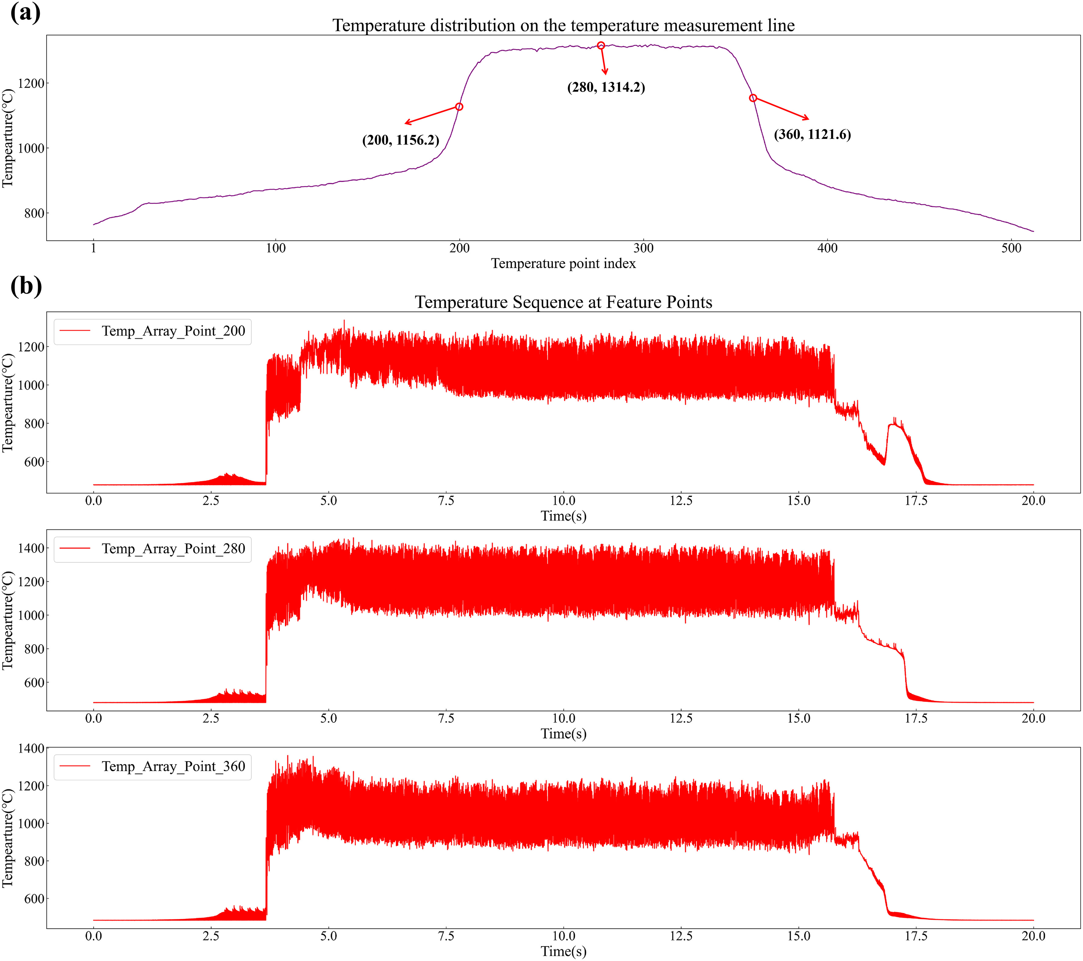 熔池温度:从线扫红外的512个温度点中选取200/280/360三个特征点(280为熔池中心峰值点,200/360为熔池边缘梯度点,兼顾温度分布的中心与边缘特征),提取特征点的时间序列后进行分帧+汉宁窗加窗,且采用温度相对比值(280/200、360/200、280/360)替代绝对温度,降低噪声干扰。