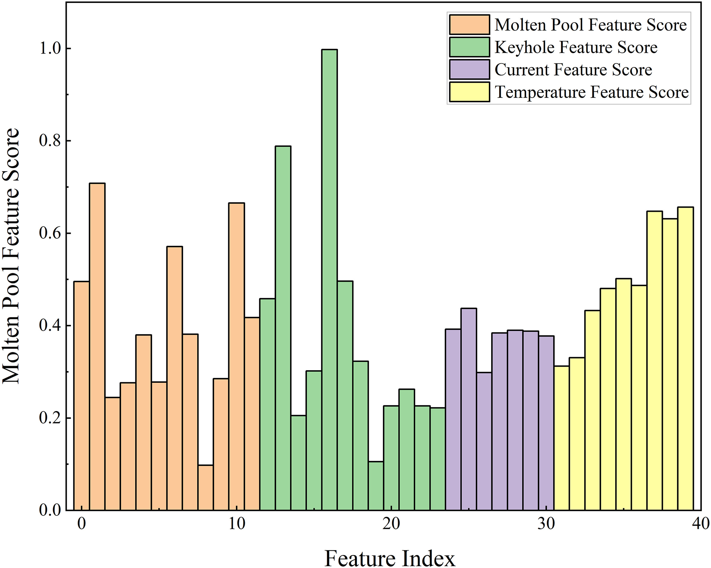 通过特征消融实验,系统验证了各特征组对缺陷识别的贡献度:剔除匙孔图像特征准确率下降6.65%(核心贡献)、剔除电流特征下降5.67%、剔除温度特征下降4.67%、剔除熔池图像特征下降4.64%;明确了匙孔图像特征在激光-MAG复合焊接缺陷识别中的核心作用,为工业端多源传感系统的硬件选型和配置提供了量化参考。