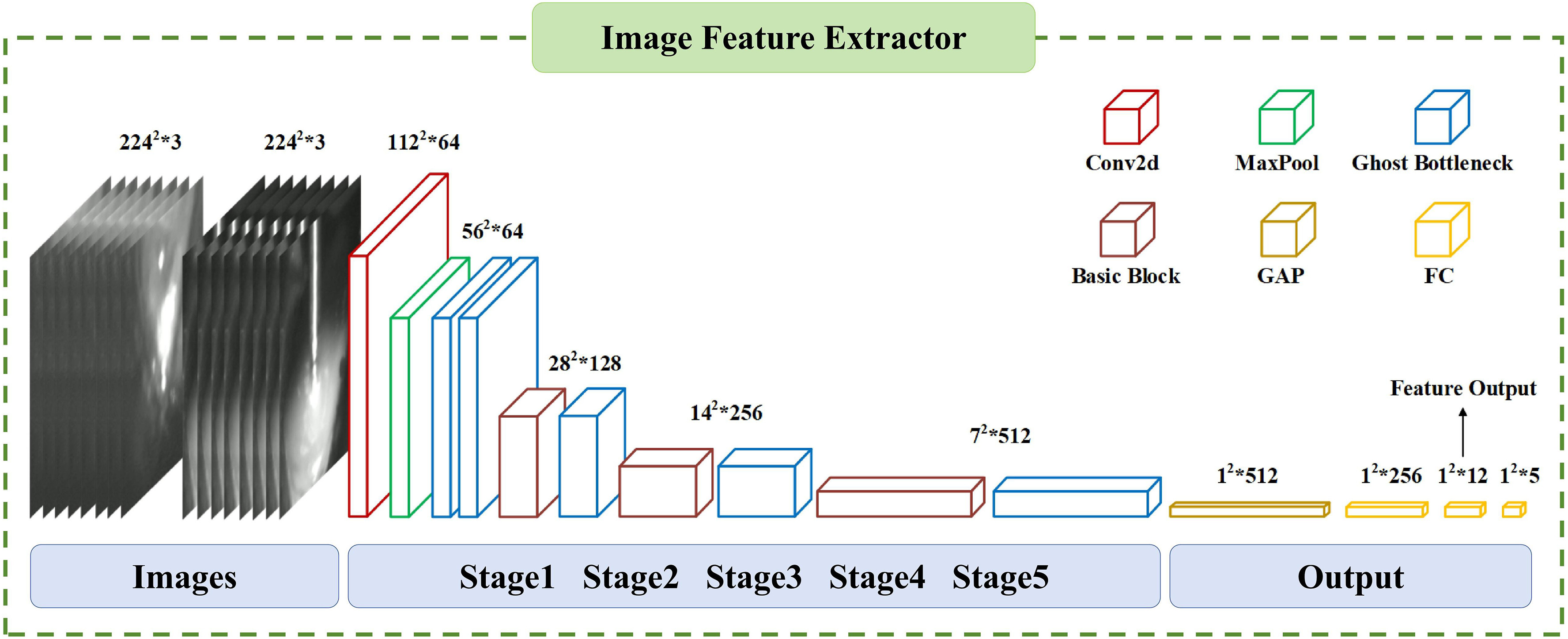 Ghost-ResNet18图像特征提取:论文的核心改进点,设计逻辑为选择性轻量化——将ResNet18的大部分Basic Block替换为Ghost Bottleneck,仅保留3个用于下采样和通道扩展的Basic Block(保证特征表示能力);最后全连接层输出12维特征,熔池+匙孔图像共提取24维深度特征;该网络在熔池图像测试集准确率96.71%,匙孔图像94.88%,单帧推理时间16.52ms;