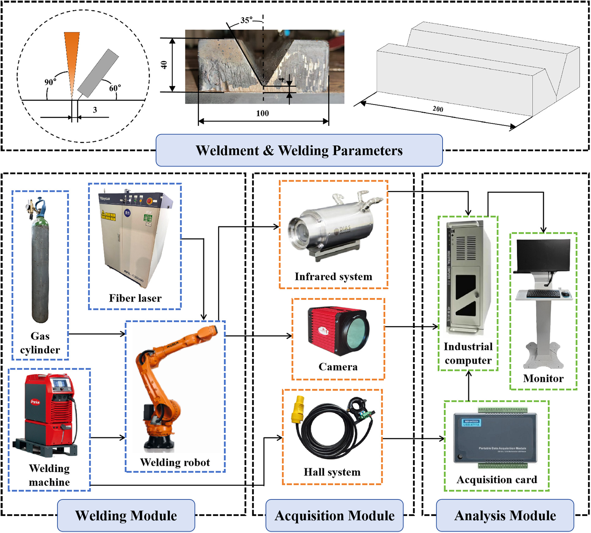 多源信息采集模块:熔池相机(采集熔池/匙孔图像)+线扫红外热成像系统(采集熔池温度)+霍尔电流传感器(采集焊接电流),由工业控制计算机(IPC)同步触发,实现信号的时间对齐;