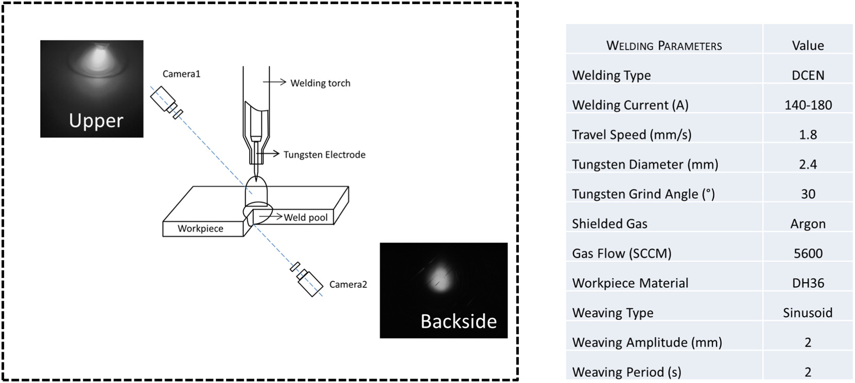 焊接参数:焊接类型为DCEN,钨极直径2.4mm、磨削角度30°,保护气体为氩气(流量5600 SCCM),焊接速度1.8/2mm/s,电流80-105A/140-180A(随机每2s变化,模拟实际生产的变工况场景)。