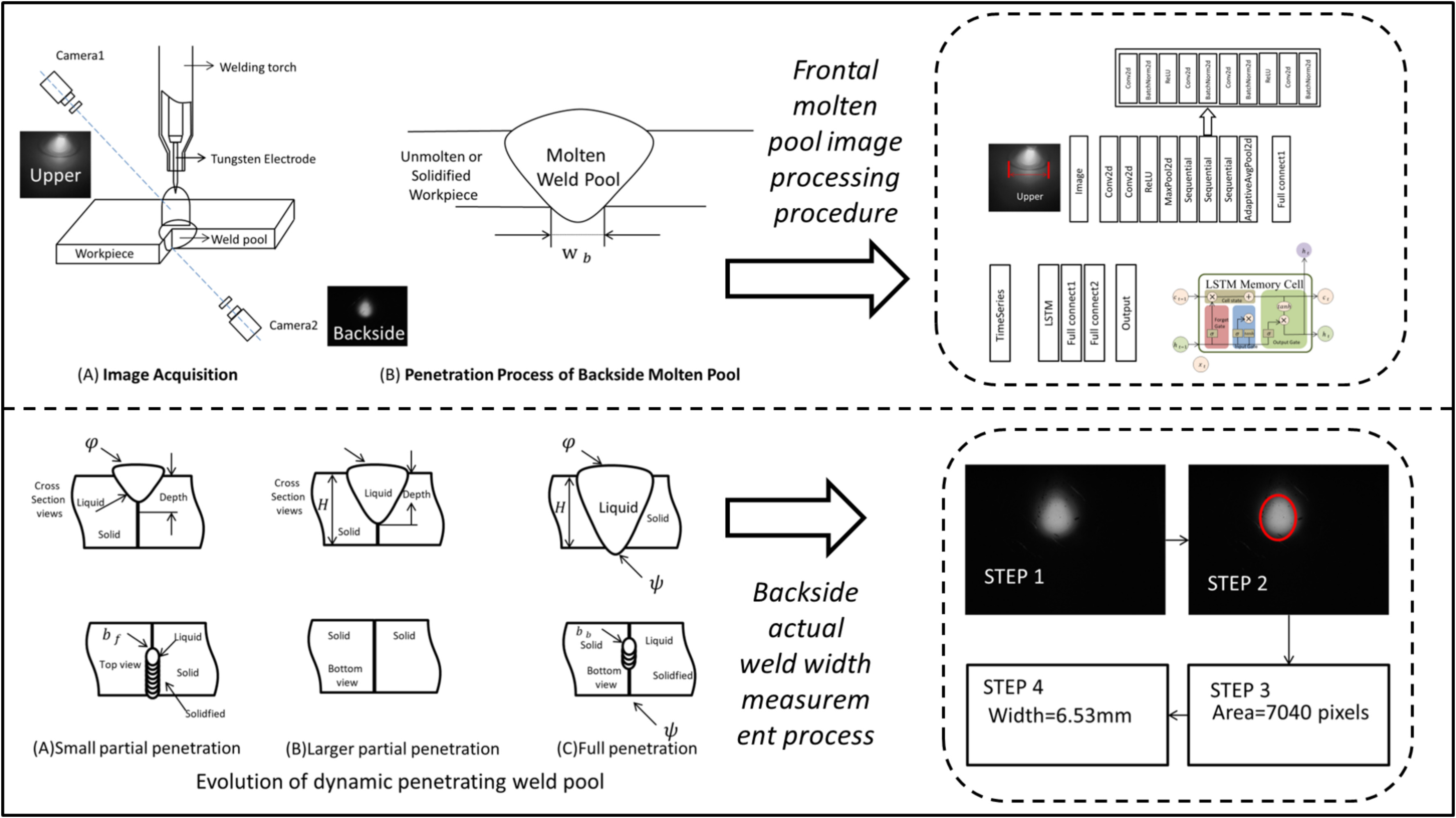 数据采集系统:双相机同步成像系统(60fps),正面相机经光学滤波抑制弧光和噪声,采集正面熔池图像,背面相机采集背面熔池图像作为标签标注依据;传感器采集焊接电流、电压等时序信号;