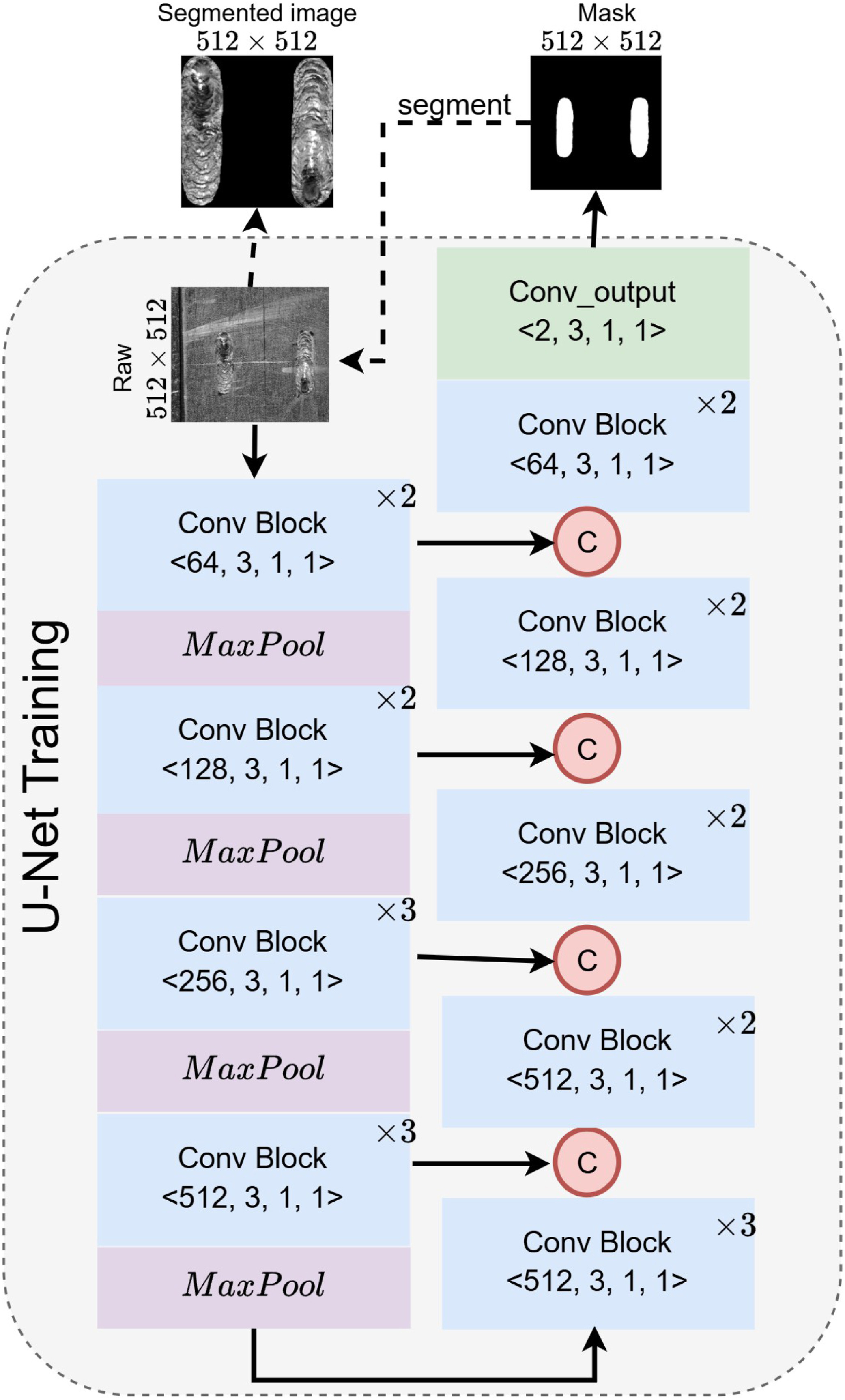 视觉端:采用U-Net模型对原始图像进行焊缝分割,生成焊缝掩码并提取感兴趣区域(ROI),去除背景划痕、亮度不均等噪声;
