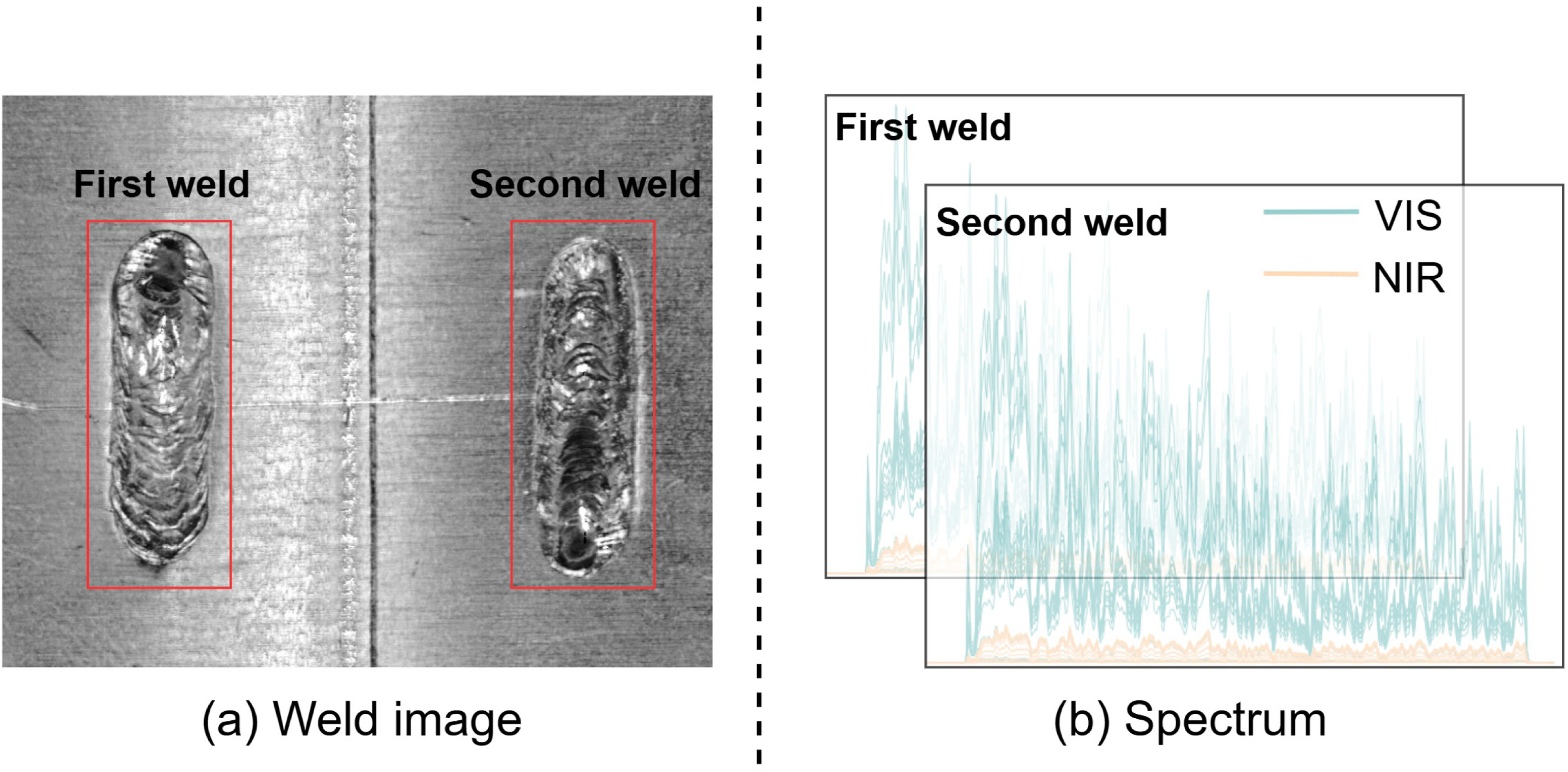 光谱数据采集:采用4D.TWO 4D传感器,选型依据为能同步采集可见光(VIS)和近红外(NIR)波段,采样率达100kHz可捕捉焊接过程的实时等离子体/温度变化,单个焊缝输出32通道(16VIS+16NIR),单个样本(2条焊缝)输出64通道光谱数据。