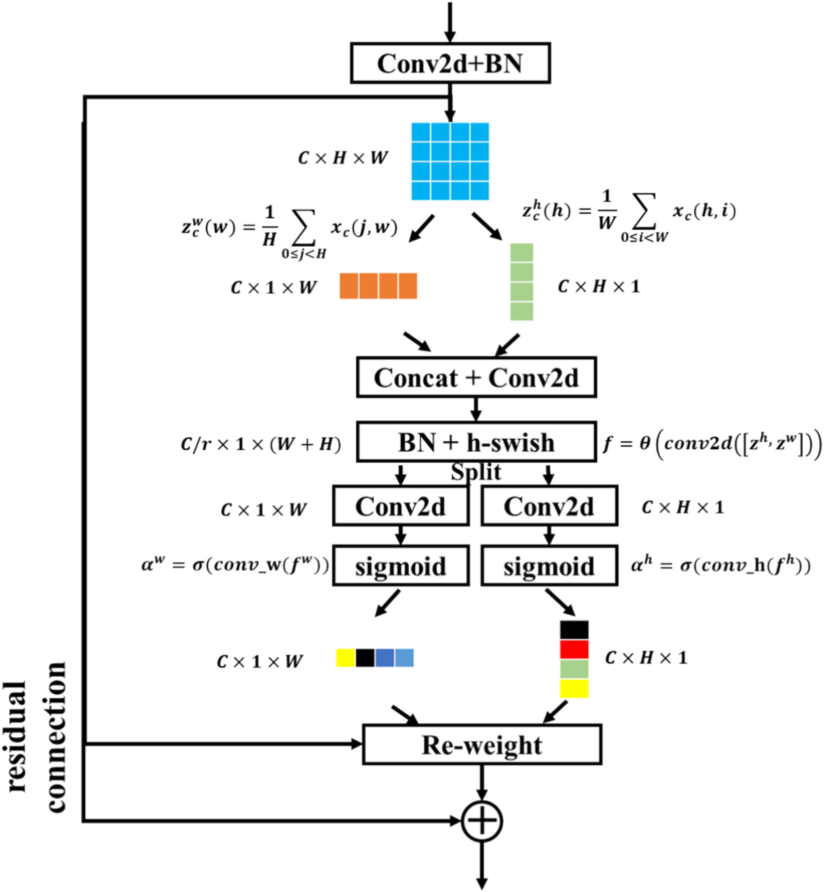 坐标注意力模块(CAM) :输入图像经2D CNN生成特征图→沿高度/宽度方向分别执行GAP,生成方向感知特征向量→向量拼接后经1×1卷积降维→拆分后恢复通道维度生成坐标注意力图→注意力图与原特征图逐元素相乘→残差连接输出,保留位置信息并实现空间特征精准定位。