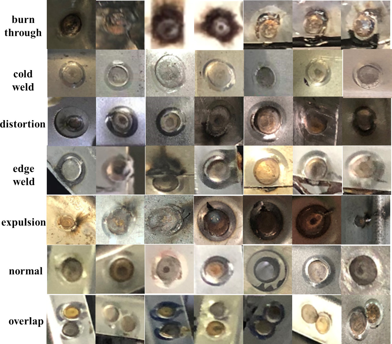 缺陷定义:划定6类典型点焊缺陷(烧穿、冷焊、变形、边缘焊、喷溅、重叠),为工业现场的常见缺陷类型;