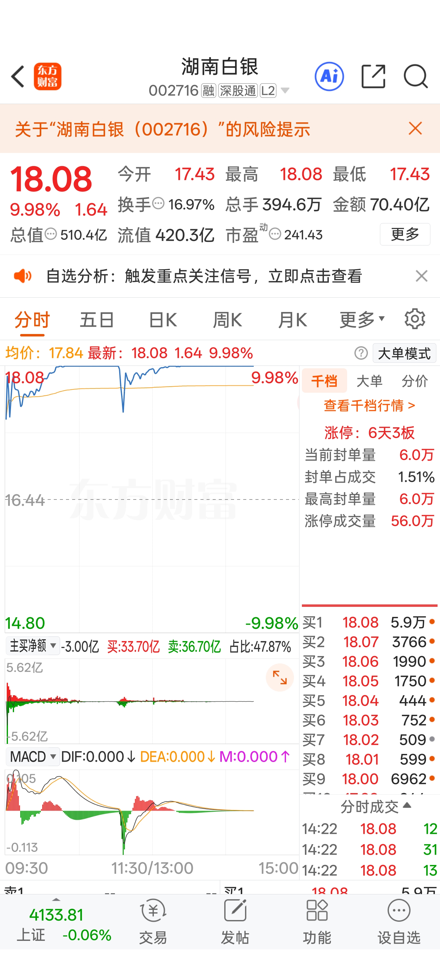 以湖南白银为例:前一交易日收盘价16.44元,当日最高涨到18.08元,涨幅9.98%,完全符合涨停标准,这就是典型的涨停板状态。